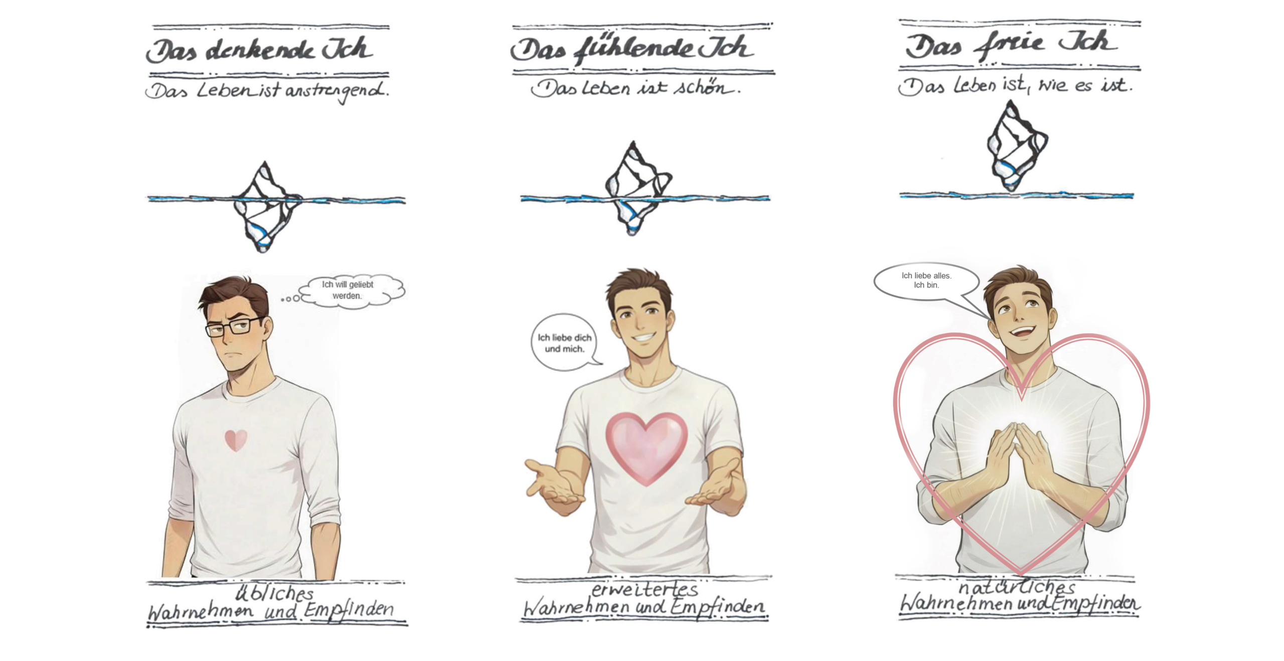 Anmerkung: In den Phasen der Selbst-Entdeckung des noch denkenden Ichs, der Selbst-Entwicklung des fühlenden Ichs und der Selbst-Entfaltung des individuellen Ichs sind die hier plakativ aufgezeigten Bewusstseinszustände fließend.